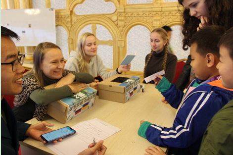 同时,来自俄罗斯、美国、德国、巴西、印度尼西亚、蒙古、日本、西班牙、塔吉克斯坦等国家的外教和留学生们也自发地参与到闯关活动中,为小学生们介绍各国语言及文化特点。