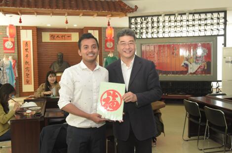 在考察国际语言文化实践教学中心——地球村中国村时,吴岩司长与正在“中华文化工作坊”上课的各国留学生们进行了亲切交谈,询问了他们在吉外学习汉语、体验中国文化的感受。这时,在我校攻读国际商务硕士学位的印度留学生罗欧汉将自己亲手制作的中国剪纸《福》送给了吴岩司长,吴岩司长非常珍惜这份礼物,并嘱咐罗欧汉努力学习、学有所成。