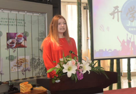 俄罗斯留学生索尼娅作为留学生代表发言。她用汉语讲述了自己在吉外的留学生活,以及在学习汉语和中国文化方面取得的巨大进步。她十分感谢学校和老师的辛勤培育,并鼓励新入学的留学生们要多参加各种活动,努力提高汉语水平,在感受和体验中国文化的过程中,更加了解中国、喜爱中国。