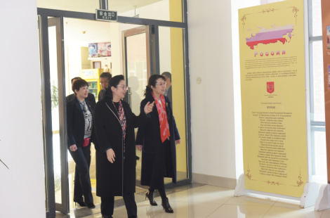 贾丽娜副市长(右)在秦和校长陪同下参观俄语村