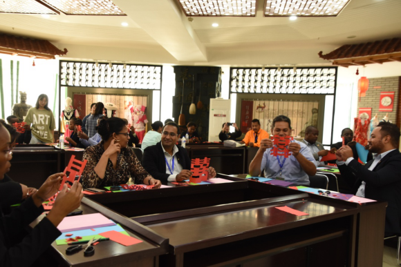参观结束后,在国际交流学院老师的耐心指导下,外国官员们在地球村中国村里,学习如何剪出“囍”字和中国的窗花。