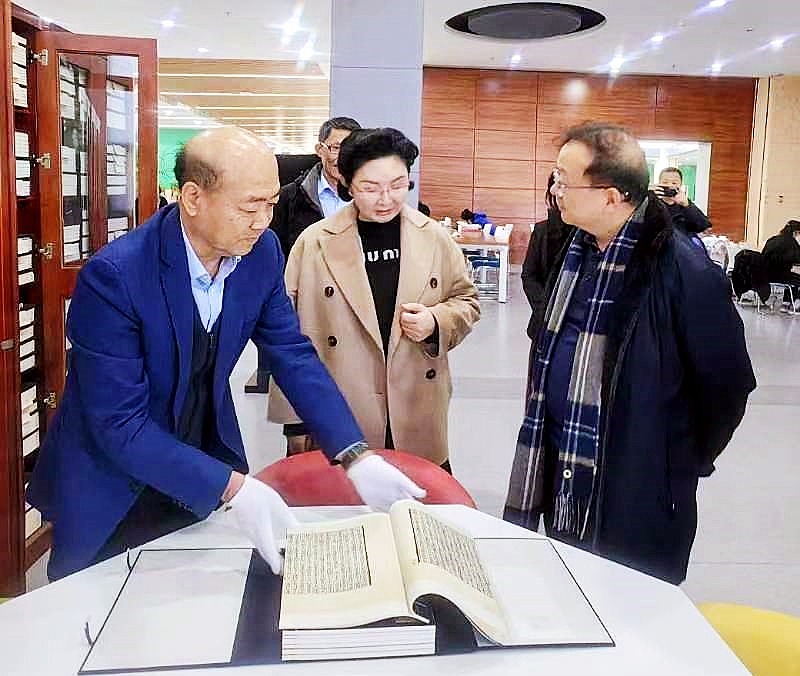 秦和校长陪同史超董事长一行参观图书馆,翻看教育部赠送学校的《中华再造善本》