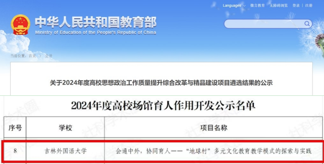 近日,教育部思想政治工作司发布了2024年度高校思想政治工作质量提升综合改革与精品建设项目遴选结果公示名单。我校报送的《会通中外,协同育人—“地球村”多元文化教育教学模式的探索与实践》项目入选“2024年度高校场馆育人作用开发”建设项目。这是我校首次获批教育部高校思想政治工作质量提升综合改革与精品建设项目。