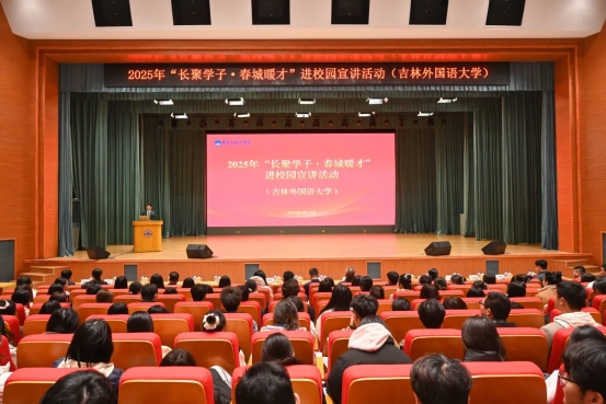 4月15日上午, 2025年“长聚学子·春城暖才”进校园宣讲活动在吉林外国语大学世桥大厦报告厅举行。长春市委常委、副市长江慧丰进行城市推介和人才政策宣讲。秦和校长,长春市教育局党组成员、长春市人民政府教育督导室专职督学张德文,以及市委组织部、市人社局、市教育局有关负责人出席。校党委书记张建华主持。近千名学生参加活动。