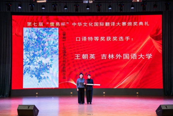 颁奖典礼在吉林外国语大学世桥大厦报告厅举行。吉林外国语大学校党委副书记苗晶、“儒易杯”中华文化国际翻译大赛创始人赵彦春、口译大赛总决赛评审组组长杨俊峰先后致辞。第八届“儒易杯”中华文化国际翻译大赛承办单位——长江大学代表发言。
