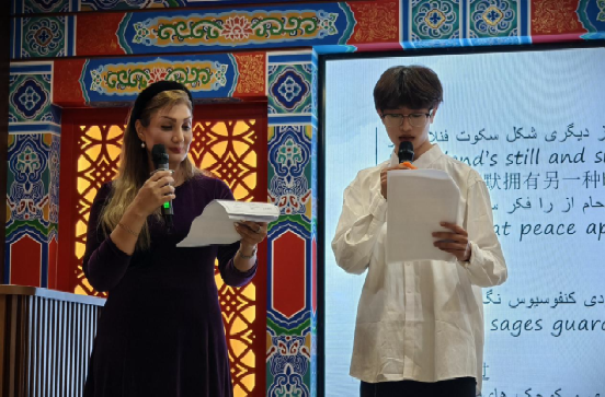 在地球村的“文化体验”板块,参与者通过“看、听、触、尝”多维互动,打破文明的距离感。蒙古外教阿泽老师现场展示蒙古国传统服饰的羊毛纹理;于鸿宇同学用生动有趣的语言详尽地介绍了梅兰芳京剧的表演体系;刘馨钰同学演绎葡萄牙法多音乐的灵魂韵律;邢佳丽、王亦菲同学带领大家沉浸式体验印尼巴迪克织物的美学与语言密码;波斯外教海伦娜老师以《跨越边界的低语:波斯女性在诗歌与文化中的声音》,传递女性的力量。京剧唱腔萦绕耳畔,竹韵与织物触感交织,让文明成为“伸手可触”的鲜活存在。