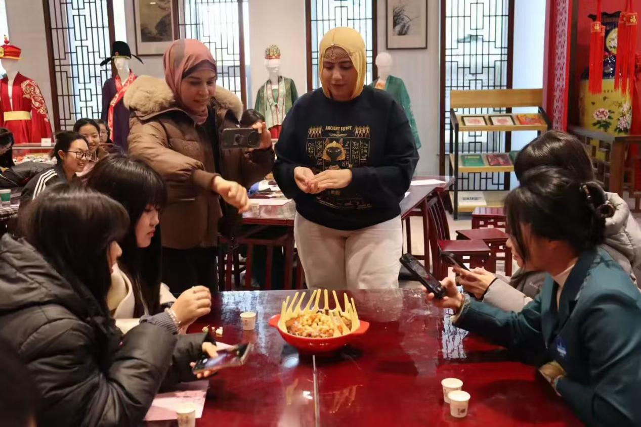 活动尾声的互动环节将氛围推向高潮:外国留学生们以各具特色的舞步传递热情与活力;在家乡美食分享中,委内瑞拉留学生宋恩与埃及留学王婷婷带来了装满地域风味的餐食,搭配手写卡片讲述美食背后的文化故事,让食物香气与文字一起成为传递温情的纽带。