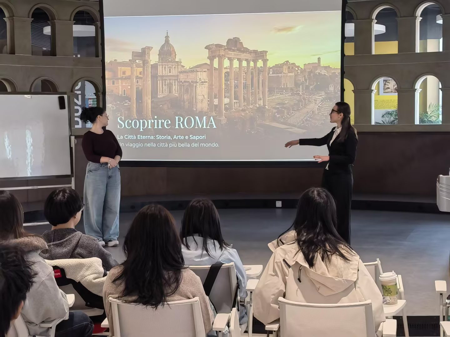 在美食环节,Elena与Lavinia揭示了罗马美食“简约朴素、丰富浓郁”的核心特质,重点介绍了罗马四大传统意面的独特风味,以及炸米团(Supplì)、炸洋蓟(Carciofi alla Giudia)等特色街头小吃。同时,她们还提及罗马街头随处可见的免费饮用水龙头(Nasoni),让学生们感受到罗马生活的烟火气息。